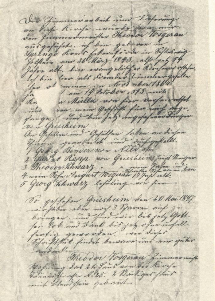 Die Zimmerarbeit und lieferung an dieser Kirche wurde von mir, dem Zimmermeister Theodor Vosgerau ausgeführt, ich bin geboren in Sprenge Kreis Eckernförde in Schleswig Holstein am 26 März 1843 alter jetz 54 Jahre alt bin evangelischer Kirchenworschaft? ich bin als Fremder Zimmergeselle [...] im November 1864 ha[...] am 19 Oktober, 1872 mit Ka[...] Müller von hier verheiratet und [...] mein Geschäft für mich ange fangen und bin jetz angesehener Bürger von Griesheim An Gesellen und Geschäften haben an diesen Turm gearbeitet und aufgestellt 1 Georg Bender von Niedasen 2 Gustav Repp von Griesheim Haupt Neiger? 3 Theodor Schwarz von Griesheim mein Paten? und Schwester Sohn 4 mein Sohn August Vosgerau 17 Jahr alt. 5 Georg Schwarz lehrling von hier. So geschehen Griesheim den 20 Mai 1897. Wir haben aber noch 3 Scharren auf zu bringen, und sind wir bis jetz Gott seilob und dank bis jetz ohne unfall fertig geworden, wer dieses Schriftstück findet bewar uns in guter andenken Theodor Vosgerau Zimmermeister Wohnung das 2 te Haus von der Kirche Taunusstraße Nr. 25. 2 Prüsiges haus mit Blendstein gebaut. Relevante Personen auf diesem Dokument: Upload: am: 11.03.2013