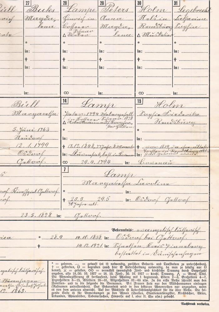 27: Bucks Magdalena 28: Lampe Hinrich in Bosseeer Schoor Weber 29: Peters Anna Magdalena 30: Holm Nels in Rendsburg Musketier 31: Segebrecht Catherina Sophia 13: Büll Margaretha * 5. Juni 1763 in: Neudorf † 12.1.1799 in: Osdorf Gettorf 14: Lamp Peter 1794 Webergesell in Bosseeer Schoor 1828 Arbeitsmann auf Borghor- ster Hütten † 17.12.1848, 77 Jahr 8 Monate in: Cluvensiek (Kluvensiek) best in Bovenau 15: Holm Sophia Friederika Rendsburg † vor 1819, da ihre älteste Tochter in Rendsburg Alt- stadt getraut wurde oo 29.4.1794 in: Bovenau 7: Lamp Margaretha Caroline † 25.5. 29.5. in: Osdorf Gettorf 70 Jahre alt.