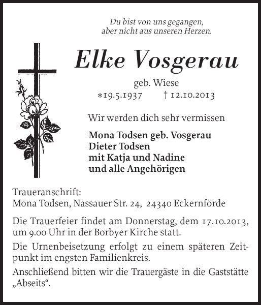 "Elke Vosgerau geb. Wiese" Kategorie: Trauer, 1164 mal angesehen